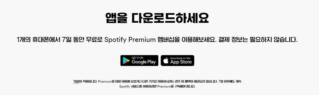 바로 요금제를 구독하기가 부담스럽다면 결제 없이 일주일간 스포티파이를 체험해보는 방법도 있습니다. 스포티파이 프리미엄에 가입한 후, 스포티파이 앱을 통해 결제 정보 없이 7일간 무료로 이용할 수 있습니다. 이 혜택은 PC에서는 불가능하고 모바일에서만 가능하다고 하니 참고하시면 좋을 것 같습니다.