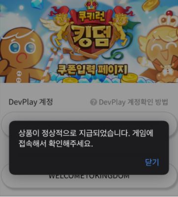 쿠폰을 적용하려면 쿠키런 킹덤 쿠폰 입력 페이지에 접속하면 됩니다. DevPlay 계정 주소와 쿠폰 번호를 입력한 후 하단의 상품 받기 버튼을 누르면 바로 혜택을 받을 수 있습니다.