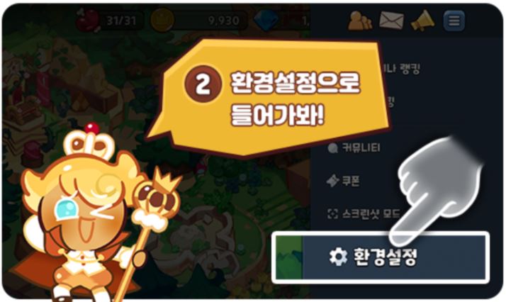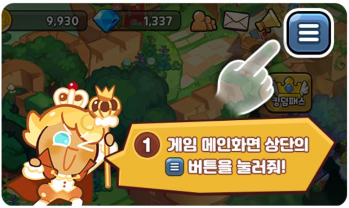 1. 쿠키런 킹덤 게임 실행 후 오른쪽 상단에 있는 메뉴 클릭
