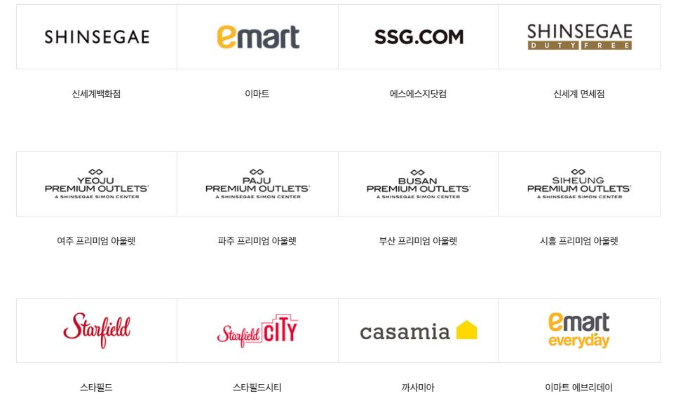 신세계 상품권은 백화점 전점, 이마트, 스타필드, 신세계 프리미엄 아울렛, 신세계 면세점 등 다양한 곳에서 쇼핑하실 때 사용하실 수 있습니다. SSG.COM 사이트와 신세계 인터넷 면세점에서도 물론 사용 가능합니다.