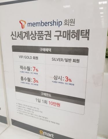 만약 T멤버십 사이트 내에서 이마트 상품권이 품절이라면, 가까운 이마트 매장 내 상품권 샵을 방문해 구매하는 것도 가능합니다. 대신 이 경우에는 모든 등급의 상시 구매 혜택이 3%로, 온라인에서 구매할 때보다 할인 폭이 작습니다. 그래도 10만 원권 상품권을 97,000원에 구매할 수 있다면 여전히 큰 이득이겠죠? 상품권 샵에서 상품권 구매 시에는 1일 1회, 1회 최대 10만원까지만 가능한 점도 알아두시면 좋을 것 같습니다. 오프라인 구매시 T멤버십 카드 또는 앱 바코드와 신분증을 꼭 지참하셔야 합니다.