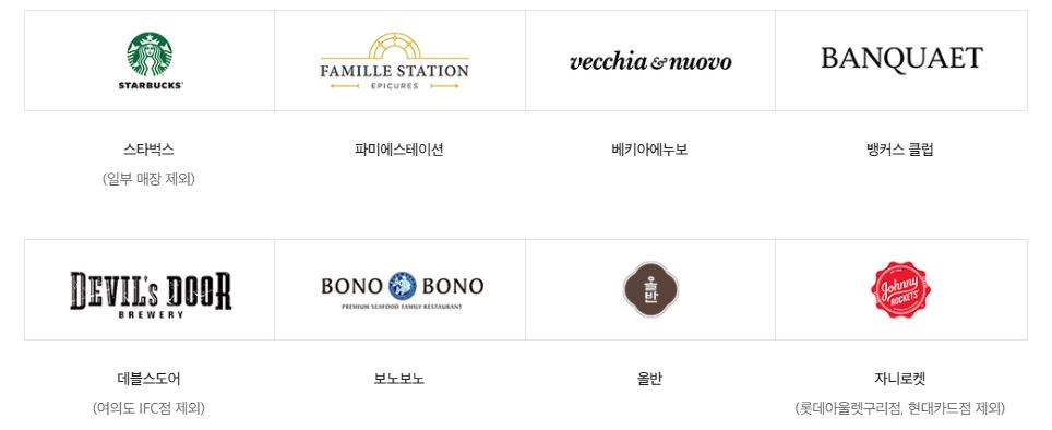 외식 브랜드로는 스타벅스, 파미에스테이션, 베키아에누보, 데블스도어, 올반, 자니로켓, 스무디킹, 빕스, 아웃백스테이크하우스, 매드포갈릭, 피자헛, 비비고, 더플레이스, 아워홈, 불고기브라더스 등에서 신세계 상품권으로 결제할 수 있습니다. 다만 지점에 따라 상품권을 받지 않는 곳도 있으니 방문 전 미리 확인하는 것이 좋습니다.