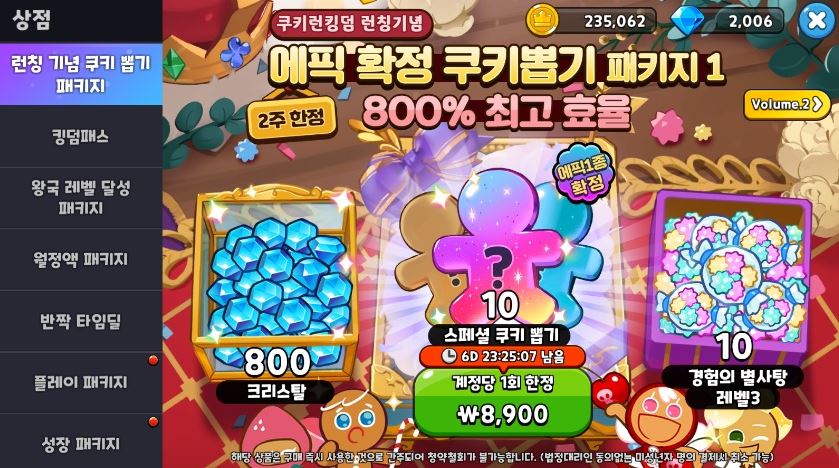 참고로, 쿠키런 킹덤 과금 패키지로는 아래와 같은 패키지를 추천합니다.