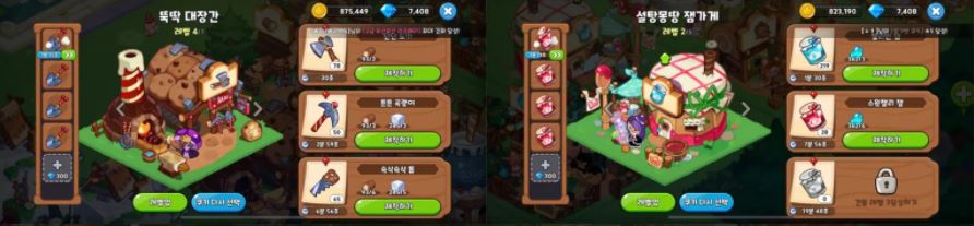 토닥토닥 도예공방과 행복한 꽃가게, 까페라떼는 3차 생산품을 만들기 때문에 레벨 2로 올리면 플레이하기 너무 힘들어질 수 있습니다. 특히 행복한 꽃가게는 레벨 2로 절대 올리지 않는 편이 유리합니다. 토닥토닥 도예공방과 행복한 꽃가게에서 제작하는 비스킷 화분, 캔디꽃은 무리해서 제작하지 않아도 괜찮습니다. 제작을 하게 되면 소원나무에 쓰지 말고 젤리곰 열차에서 필요할 때 쓰는 편이 낫습니다.