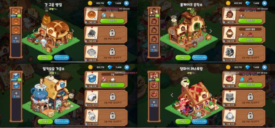 - 1차 재료 건물 중 나무 젤리빈 각설탕은 레벨 업 해도 효율이 늘어나진 않음(나머지는 늘어남)