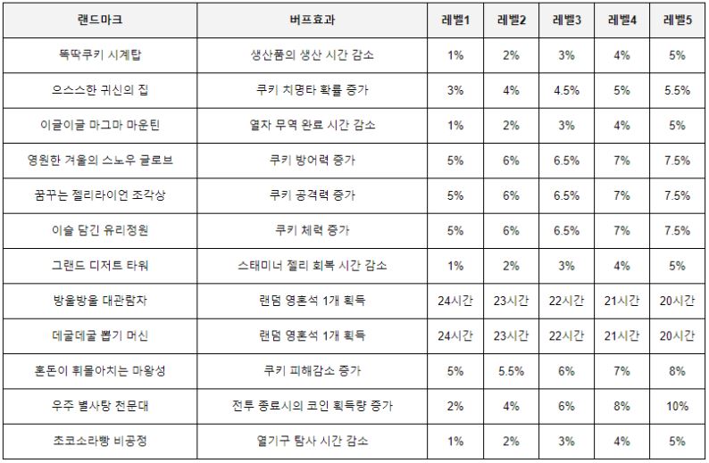 쿠키런 킹덤 내 랜드마크는 총 13개입니다. 12개는 꾸미기 메뉴에서 만들 수 있고, 1개는 킹덤 패스의 별사탕 랜드마크입니다. 쿠키 성이 8 레벨에 도달하기 전에는 재료를 모으기가 상당히 힘들기 때문에 랜드마크 건설과 업그레이드는 그 이후에 진행하는 것이 좋습니다.