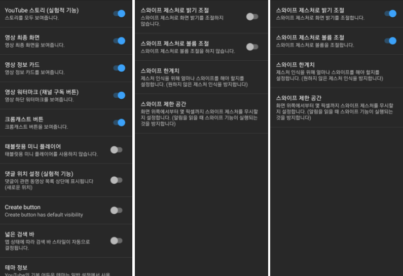 이외에도 영상 최종 화면, 정보 카드, 워터마크 등을 표시할지 말지 설정에서 내가 원하는 대로 커스터마이즈 할 수 있습니다. 스와이프 제스처로 볼륨이나 밝기를 조절할 수 있도록 활성화해두면 간단한 손동작으로 빠르게 조절할 수 있어 편리합니다.